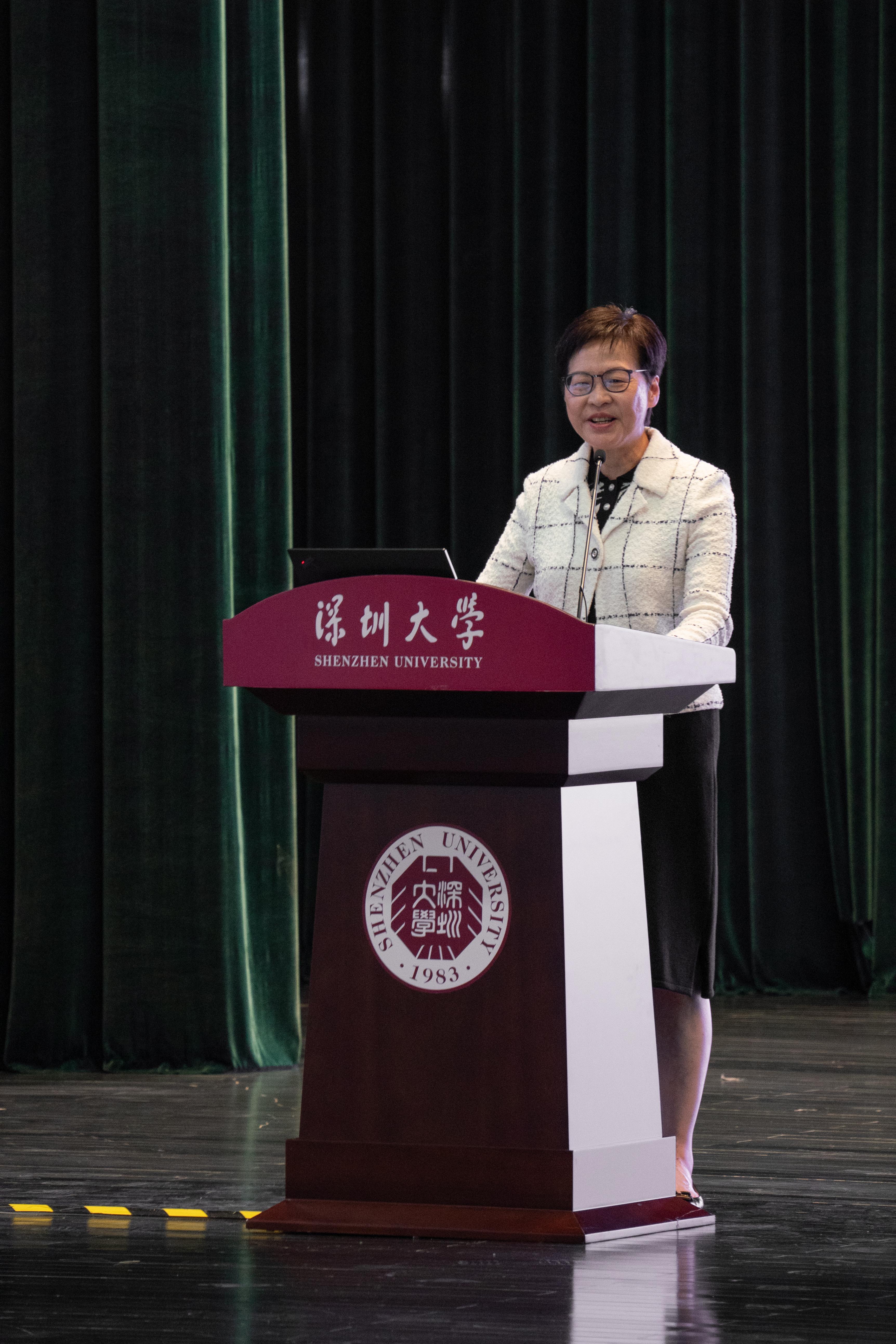 “港深地理位置接近,大学的教授可以方便地往来,深圳大学可以跟香港的大学开展更多方面的交流合作。”9月27日是深圳大学建校40周年,香港特别行政区前任行政长官林郑月娥做客“深大讲坛”“荔园金声讲堂”,在深圳大学丽湖校区文汇礼堂进行了一场演讲,分享“一国两制”下的港深双城故事,对深圳大学加强与香港的交流合作表示期许,鼓励深圳大学的港生融入国家发展大局,共同参与丰富“一国两制”实践。深圳大学副校长张晓红主持报告会。