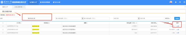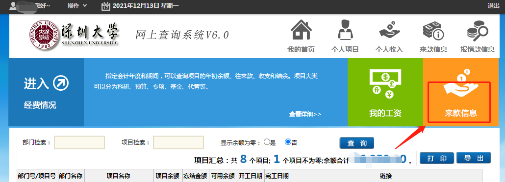 9)等待社科部管理员审核并推送到学校财务部,待收到财务已入账信息或登录财务查询系统查到项目经费号后即可报销。