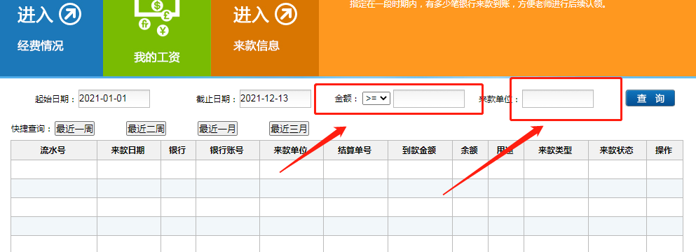 4)按来款金额或者来款单位查询到账情况: