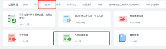 6)经费对接至科研管理系统后,登录科研管理系统,选择【经费】→【入账办理申请】。