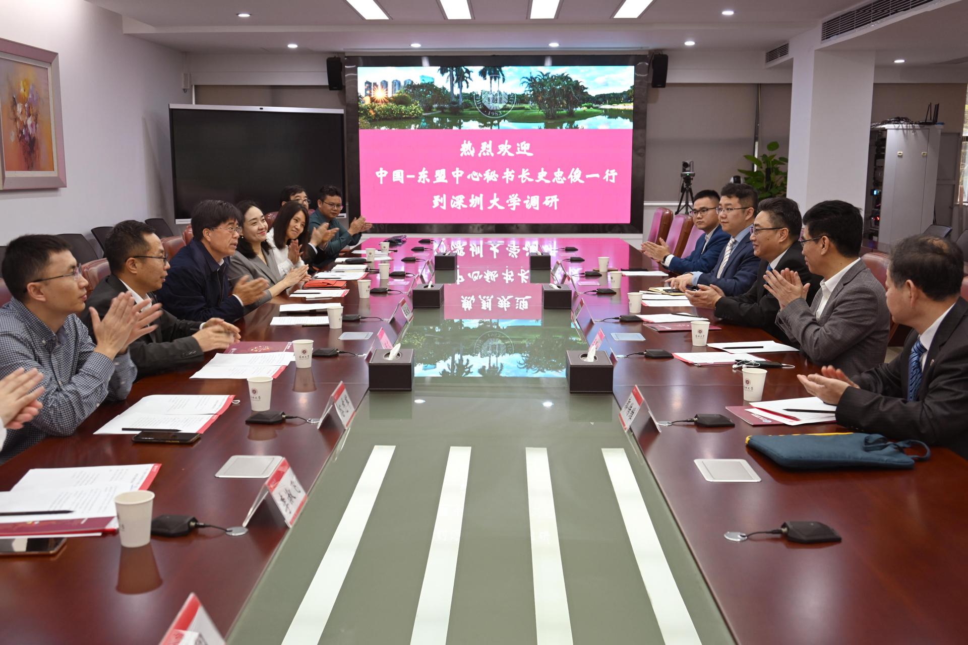 4月3日上午,中国—东盟中心秘书长史忠俊、贸易投资部主任郭传维,全国政协委员、广东高科技产业商会会长王理宗一行到访深圳大学。深圳大学党委书记李清泉、副校长汪永成会见来宾,双方在深圳大学粤海校区汇元楼举行座谈。