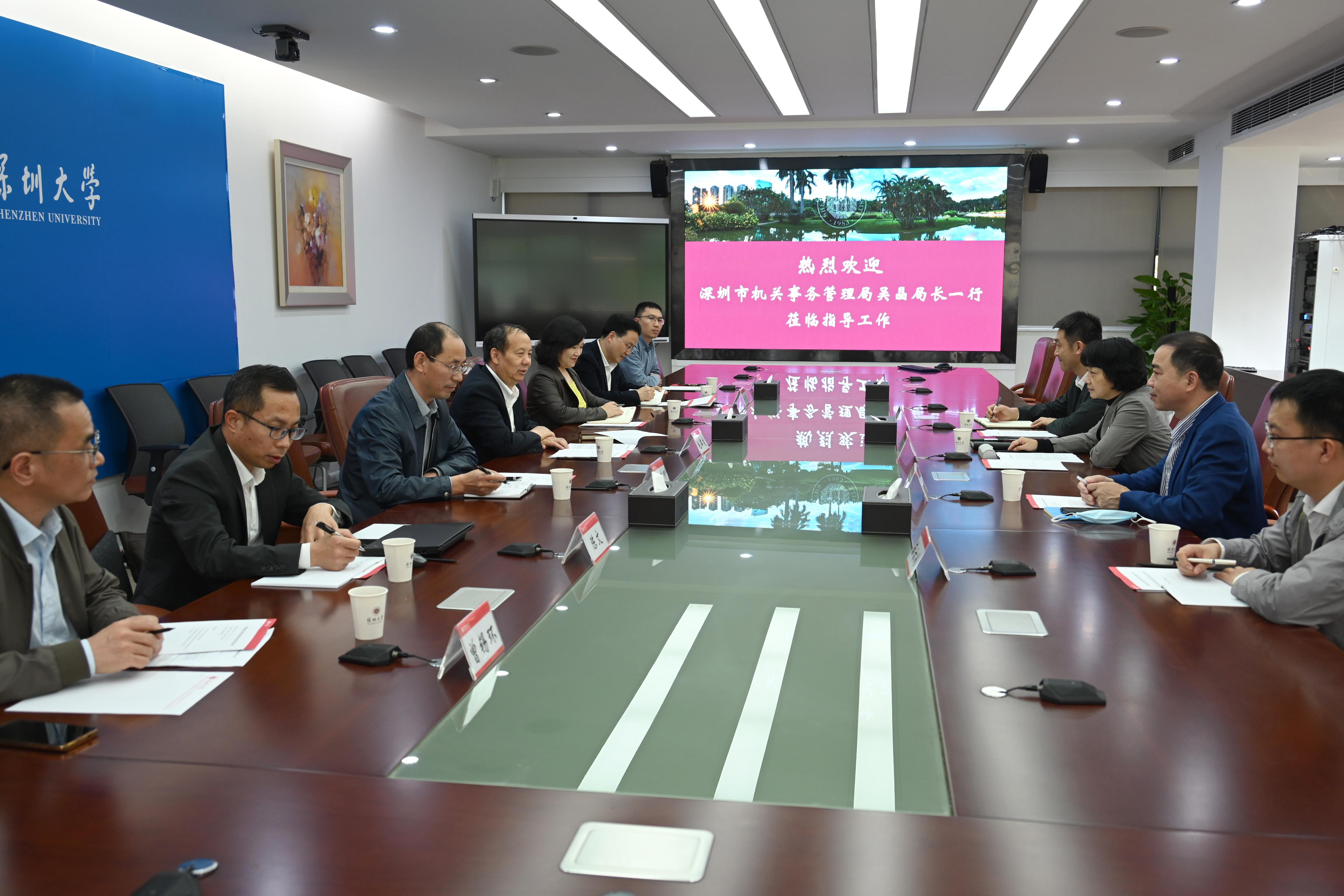 2月24日下午,深圳市机关事务管理局党组书记、局长吴晶,党组成员、副局长谢锦辉一行来访深圳大学,校长毛军发、副校长张晓红在粤海校区汇元楼201会议室接待来宾。双方就加快推进深圳大学机关事务研究院建设进行座谈交流。