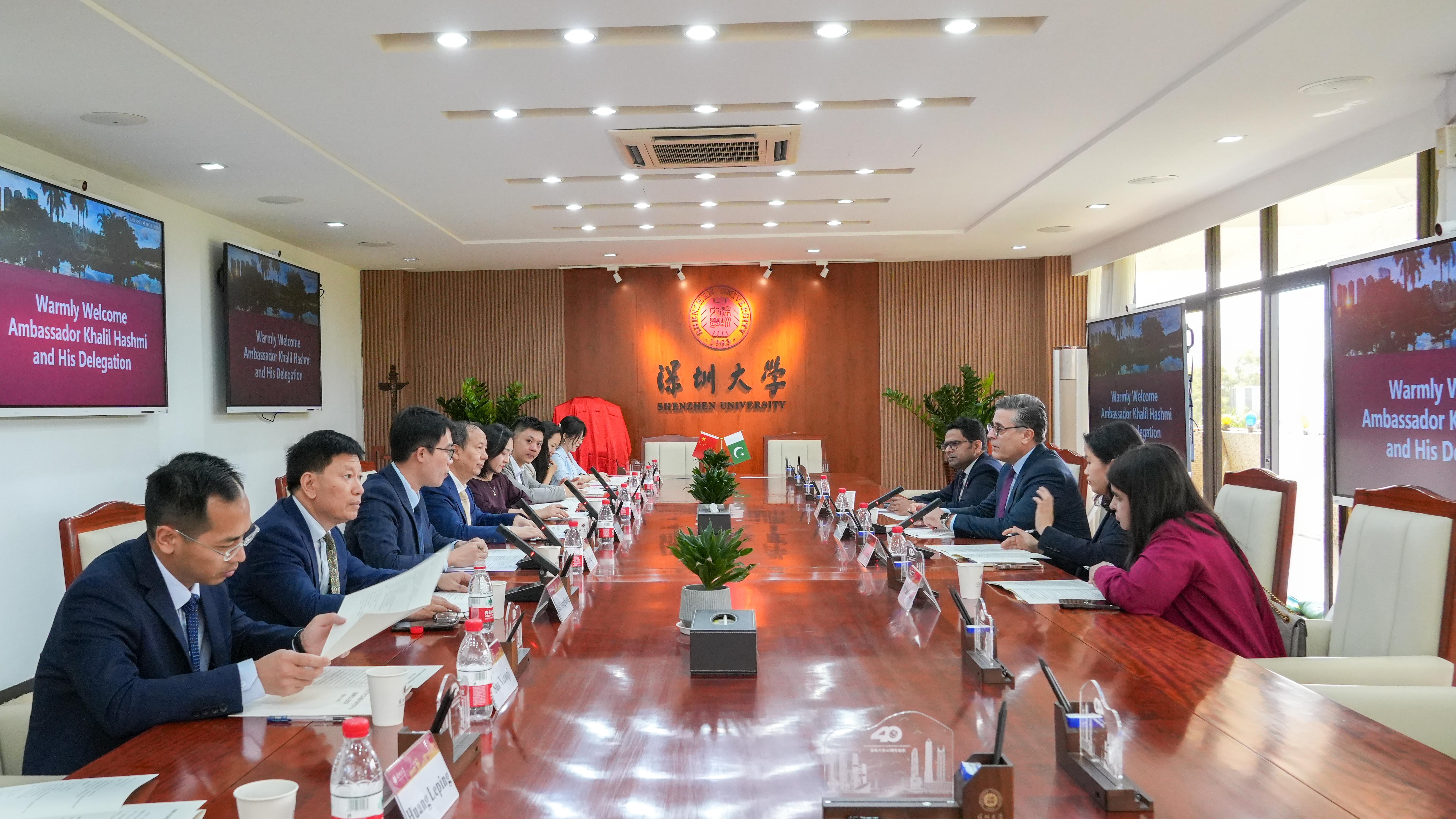 4月16日上午,巴基斯坦驻华大使、驻广州总领事卡里尔·哈什米一行来访深圳大学,深圳大学校长毛军发会见来宾,双方在粤海校区汇元楼401会议室签署合作备忘录,共建“深圳大学巴基斯坦研究中心”,并共同为中心揭牌。