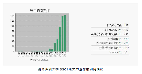 另外根据Web of Science 核心合集中统计的结果显示,深圳大学社会科学科研成果的影响力在近年也呈现出十分明显的增长趋势。从1997年至今,深圳大学SSCI论文共被引用达487次,篇均引用2.47次,H指数为10,即有10篇文章被引次数不少于10次,引文数从2011年开始高速增长,详情如下图: