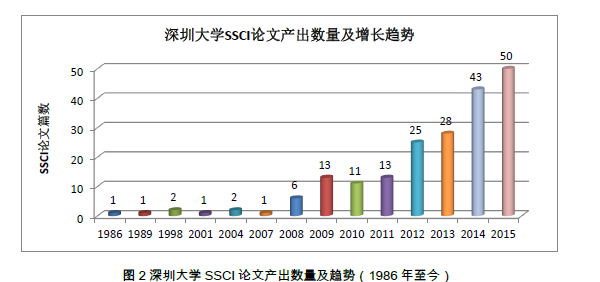 从SSCI数据库统计结果来看,1986年至今深圳大学共产出197篇SSCI论文。统计分析这197篇SSCI论文的发表时间,可以清晰地看出我校SSCI论文的产出趋势,从1986年开始,深圳大学SSCI实现零的突破,随后成波动增长趋势,自2009年起多于十篇,2012年开始,增长迅猛,SSCI论文发表数量从2011年的13篇增长至2015年的50篇,增速近300%。