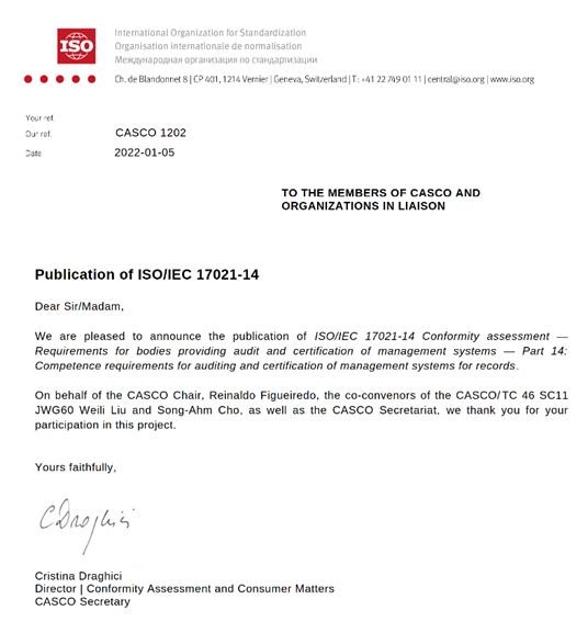 由我校刘伟丽教授作为联合召集人的国际标准ISO/IEC 17021-14 Conformity assessment — Requirements for bodies providing audit and certification of management systems — Part 14: Competence requirements for auditing and certification of management systems for records正式发布。该标准作为合格评定工具箱之一,主要研制在文件管理体系(MSR)审核和认证过程中人员的能力要求, 并补充ISO/IEC 17021-1中现有的通用能力要求。同时,刘伟丽作为该工作组的国内对口工作组联合召集人,继续积极主动参与该国际标准的国家标准研制工作。