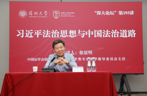 2024年4月1日下午,中国法学会副会长、教育部法学类专业教学指导委员会主任徐显明教授莅临深大法学院,并做客“深大讲坛”第193期,主讲“习近平法治思想与中国法治道路”。本期讲坛由深圳大学社会科学部、深圳大学法学院联合主办。深圳大学副校长汪永成、社会科学部主任曾宪聚、深圳人才集团董事长高大伟以及深大法学院100余名师生参加讲座。讲座由熊伟院长主持。