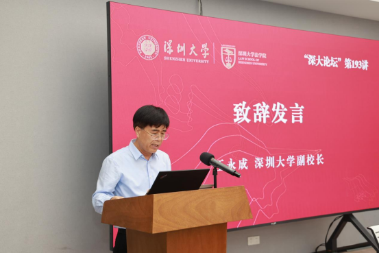 深圳大学副校长汪永成教授代表学校致辞。他对徐显明教授的到来表示热烈欢迎和衷心感谢,高度赞扬徐显明教授在法学研究领域、法学教育领域和服务国家法治建设方面做出的卓越成就和贡献。他表示,深圳大学正在全力建设高水平法学院,期待徐显明教授给予更多的指导和帮助。