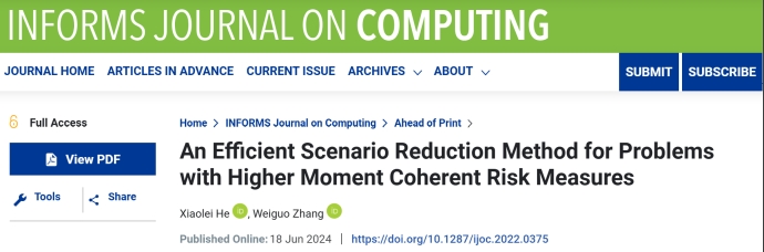 近日,我院管理科学系何小雷助理教授和张卫国教授的学术论文“An Efficient Scenario Reduction Method for Problems with Higher Moment Coherent Risk Measures”被国际顶级期刊 INFORMS Journal on Computing(IJOC)录用并在线发表。该期刊是美国运筹学与管理科学协会(INFORMS)的会刊之一,也是国际公认的商科顶尖期刊UTD24之一。该研究成果以何小雷助理教授为第一作者、张卫国教授为通讯作者、深圳大学管理学院为唯一署名单位。据统计,IJOC自2008年以来发表的论文中,仅由中国内地的学者和单位署名论文的数量不超过25篇,其中张卫国教授和何小雷助理教授合作发表了2篇。