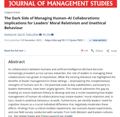 管理学院助理教授何国华的论文“The Dark Side of Managing Human–AI Collaborations: Implications for Leaders’ Moral Relativism and Unethical Behaviour” 于2025年12月正式在管理学领域国际顶级期刊Journal of Management Studies在线发表。该论文以深圳大学管理学院为第一作者单位,其他合作者包括中山大学管理学院倪丹助理教授,厦门大学管理学院赵璞初助理教授,以及中山大学管理学院秦昕教授。